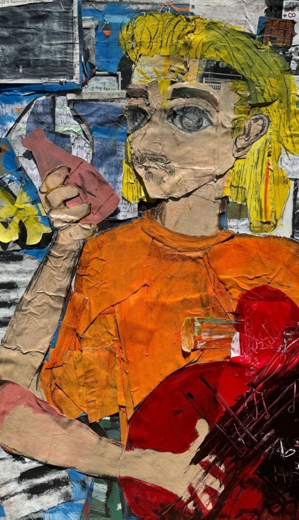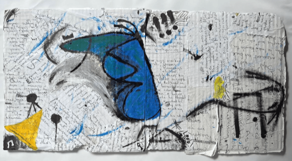 In a way it was a bunch of things, but I just started studying more art, and I really liked the painters and I was like… well, there’s two things.  One was Jim Morrison.  I really liked Jim Morrison and his poetry.  I would sketch in the poetry books, just sketch weird things.  And then one day I had cardboard and papers and I papier-mâchéd a painting.  And I only had a small tube of blue paint, so I broke a pen to use the ink.  And I think the painting turned out pretty good.  And I have it hung up still.  That was back in 2019.