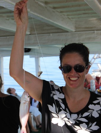 After that we stopped for a spot of fishing. A few people caught some little fishies, throwing them back after taking a photo (the fishing season hadn’t officially started yet). As we started the engines to take off home again, I had an urge to throw my reel back in the water and as we took off I had a bite!! The captain stopped the boat and I reeled in a MONSTER fish! It could have fed a small Omani village for days, don’t you think??