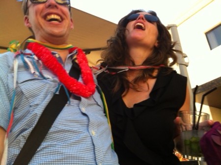 You know you’re having fun when you throw your head back laughing (and have party decorations all over your person).