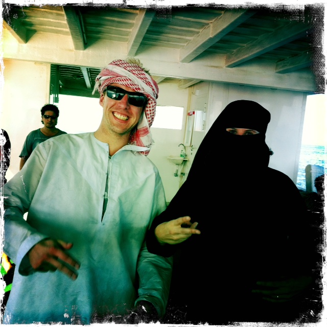 The cruise included a really yummy BBQ lunch of tandoori chicken, roast veggies, salads and a typical Omani dish of rice and meat. After lunch, the staff put on some Arabic music and got everyone dancing. And then (oh, horror of horrors) it was time to dress everyone up in the traditional Arabic dress of abaya (for women) and khandoura (for men). Now, when it started dawning on me that this was going on I started to slowly back away from the group, retreating towards the other end of the boat. There is no longer any novelty factor in me dressing up as an Arabic woman, and I prefer not to do it. I don’t think that donning a religious outfit is the most respectful thing in the world to do. But wouldn’t you know it, when it was Greg’s turn to dress up, the captain of the boat came and found me and coerced me into trying on the abaya. I resisted, I swear. I put up a fight. But he laid a guilt trip on me, saying that Greg would be disappointed if there was no girl next to him for the photos. Sheesh Greg, the things I do for you!