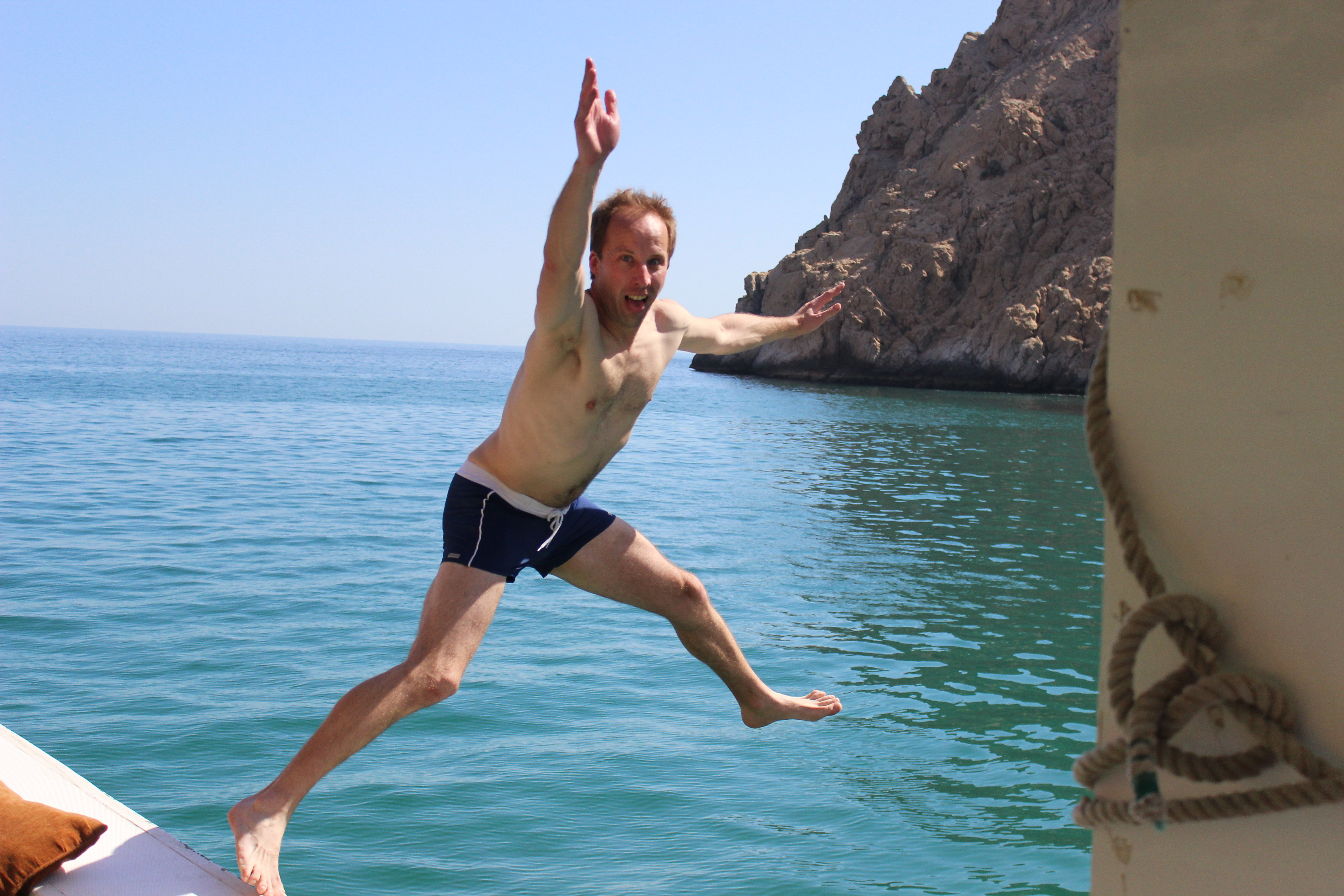 We were booked on a five hour dhow cruise in the Gulf of Oman, stopping several times to swim, snorkel and splash in the gorgeous blue water. David, Greg and I were the only ones onboard that were brave enough to jump off the second level of the dhow into the crystal clear waters. I admit I almost didn’t do it. It was pretty scary perched out there on the railing looking down at the water several metres below. But I had David count me down and just jumped when he ran out of numbers! It was exhilirating.
