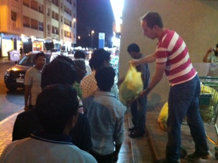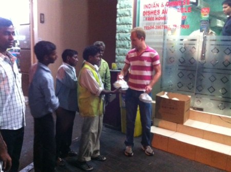 Greg handing out the hot meals from the Indian restaurant. An Emirati man passing by decided he’d line up for a free meal too. Nice try mister!!!