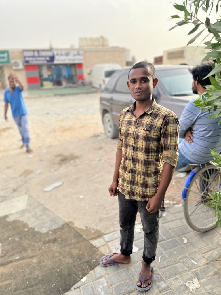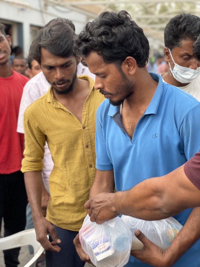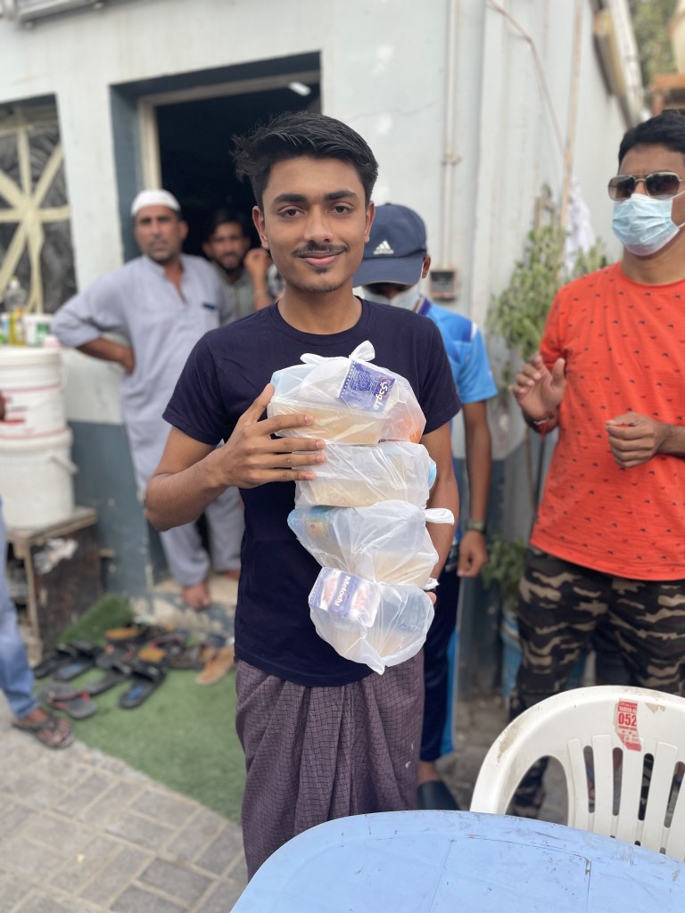 I always get a kick out of being at these food handouts, witnessing the gratitude on the faces of the men, feeling the love that comes from giving to someone in need. And this year did not disappoint. This time though, there was a feeling in the air that was different. Normally we hand out the meals from the back of a van on the street, but this time the meals, packed up in boxes, had been placed inside one of the dormitories. That made it feel more intimate, and more personal. We were in their world now. It was also more chaotic than usual because guys from neighbouring labour camps had caught wind of the handout and swarmed the joint. It always feels really bad that we can’t feed every single person who needs a meal, but that’s life I guess. We were there to give food to the guys living in that particular dorm, and that was made a little tricky by the interlopers. Eventually we figured out a system in which a representative from each room would approach and tell us how many men he was cohabiting with (usually between six and nine) and he would then be given the correct number of bags, each containing some dates, a piece of fruit, a bottle of water, some laban and a hot, tasty biryani. That system seemed to work out OK.
