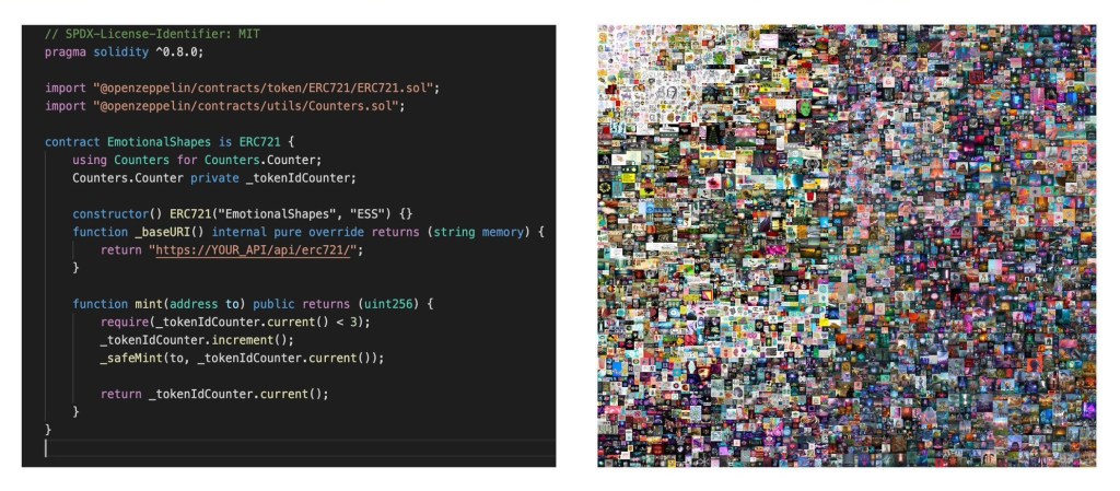 So far we’ve shown that non-fungible means unique and one of a kind.  And we’ve established that tokens are lines of code on a blockchain which identify, certify and represent an asset.  But did you know that when we talk about non-fungible tokens, the non-fungibility (i.e. the uniqueness) isn’t actually referring to the asset at all.  It is the token’s code itself which is unique and non-fungible.  The combination of the token ID number and the smart contract address (i.e. where it sits on the blockchain) unite to create something unique.  No other token can ever have this combination of numbers.  And that, ladies and gentlemen, is what makes a token non-fungible.  To demonstrate how that relates to art, if a photographer were to print out 100 physical copies of a single image, those prints would all be fungible.  They are mutually interchangeable and there’s nothing to differentiate them.  But if that photographer were to mint 100 individual versions of that same image on the blockchain, each piece would have its own unique NFT representing it, resulting in 100 unique digital assets.  And despite them all looking the same, they would no longer be mutually interchangeable.  So, to reiterate, the NFT is not the artwork.  The NFT is the code that represents the artwork.  And it exists in order to certify the asset, as well as to facilitate its sale, purchase and transfer.