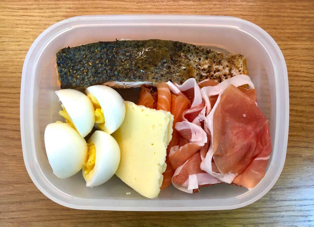 I had a deli-style lunch at work today.  Some salami, prosciutto, smoked salmon, a couple of boiled eggs and a piece of cheese.  It was nice, and actually so filling that I couldn’t even finish it all, in one sitting.  While cold cut meats are very convenient, I think we’ll eat them scarcely, if at all.  It’s not exactly stuff that our bodies were evolved to eat, so we’ll try to stick to animal products that have been messed around with as little as possible.
