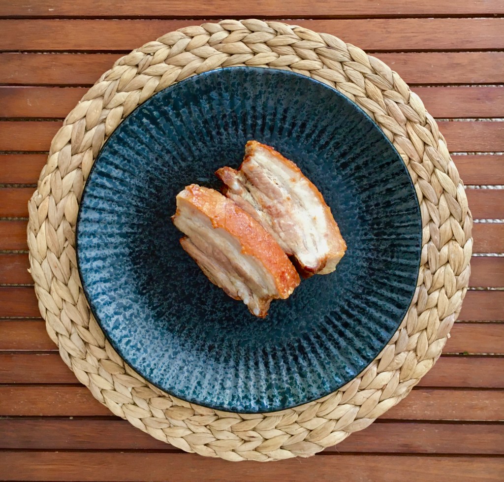While I was at work last night, David slaved in the kitchen at home, preparing a juicy cut of pork belly for our lunch today.  And let me tell you it was bloody delicious.  I love pork belly but it’s always seemed a bit difficult to get the skin just right.  Our oven is a temperamental son of a bitch and I just don’t trust it with such a beautiful cut of meat.  The air fryer on the other hand, was totally up to the task.  The crackling, as you can see, was phenomenal.