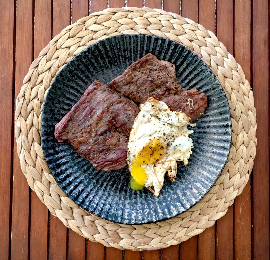 My new, absolutely favourite, cut of meat: skirt steak. We sear this 2-3 minutes each side on a sizzling hot pan and it's good to go.