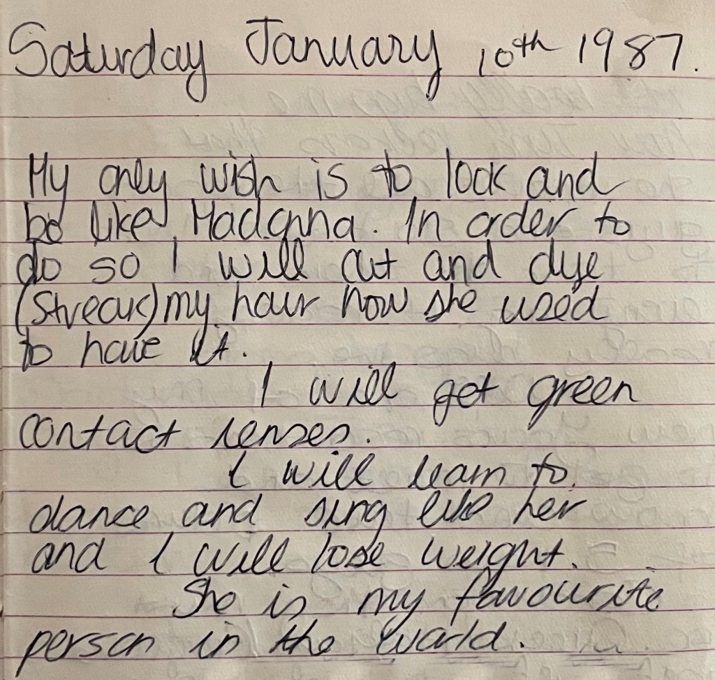 I’m not sure I can select an example of a particular piece of pop culture, but the artist that influenced me the most growing up was Madonna.  Oh man, I wanted to be her so bad.  I styled my hair like hers (hairsprayed, teased to the max and tied up with big raggy bows), I wore the same clothes (including, of course, the rubber bracelets, the crucifixes and the fishnet crop tops).  I even bought coloured contact lenses and bleached my hair with lemon juice and Sun-In.  Her MTV music video premiers were major events in our house, and I bought all her albums and learned all the lyrics.  Her posters adorned the four walls of my bedroom, and I knew absolutely everything about her.