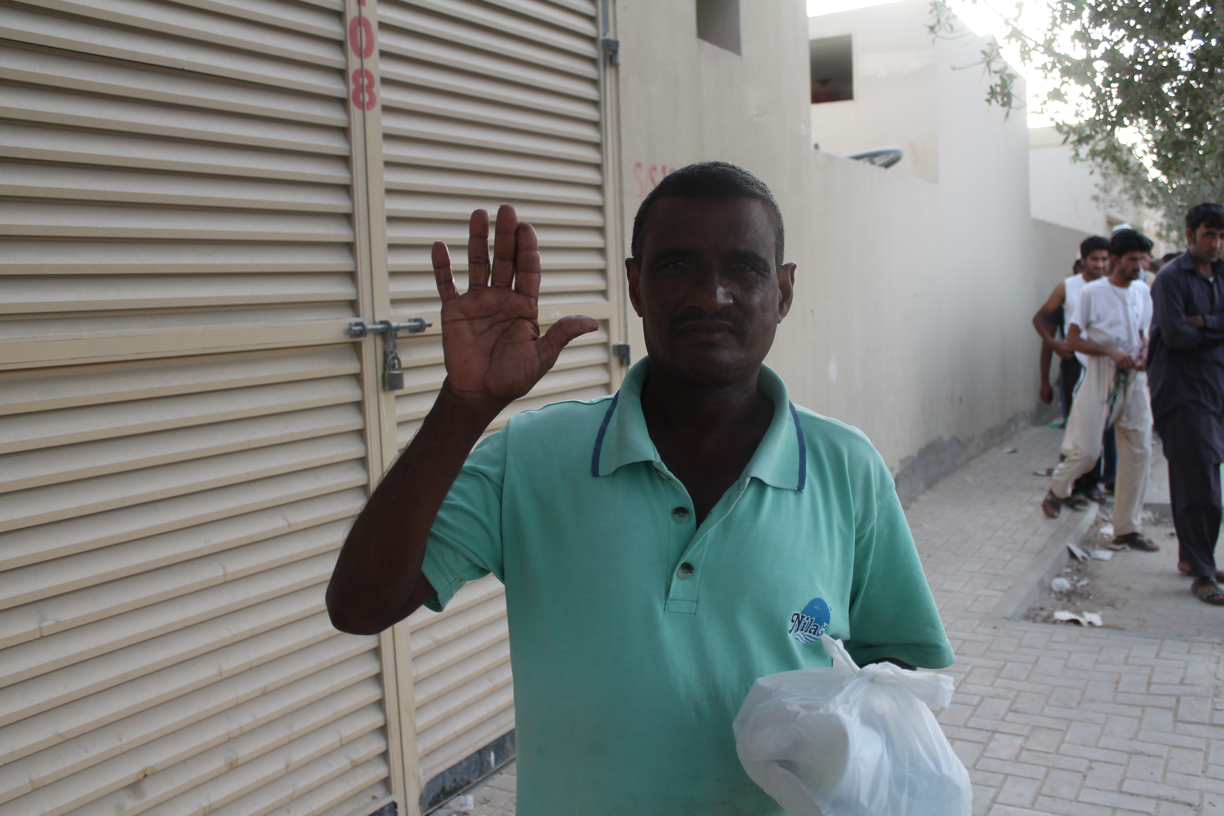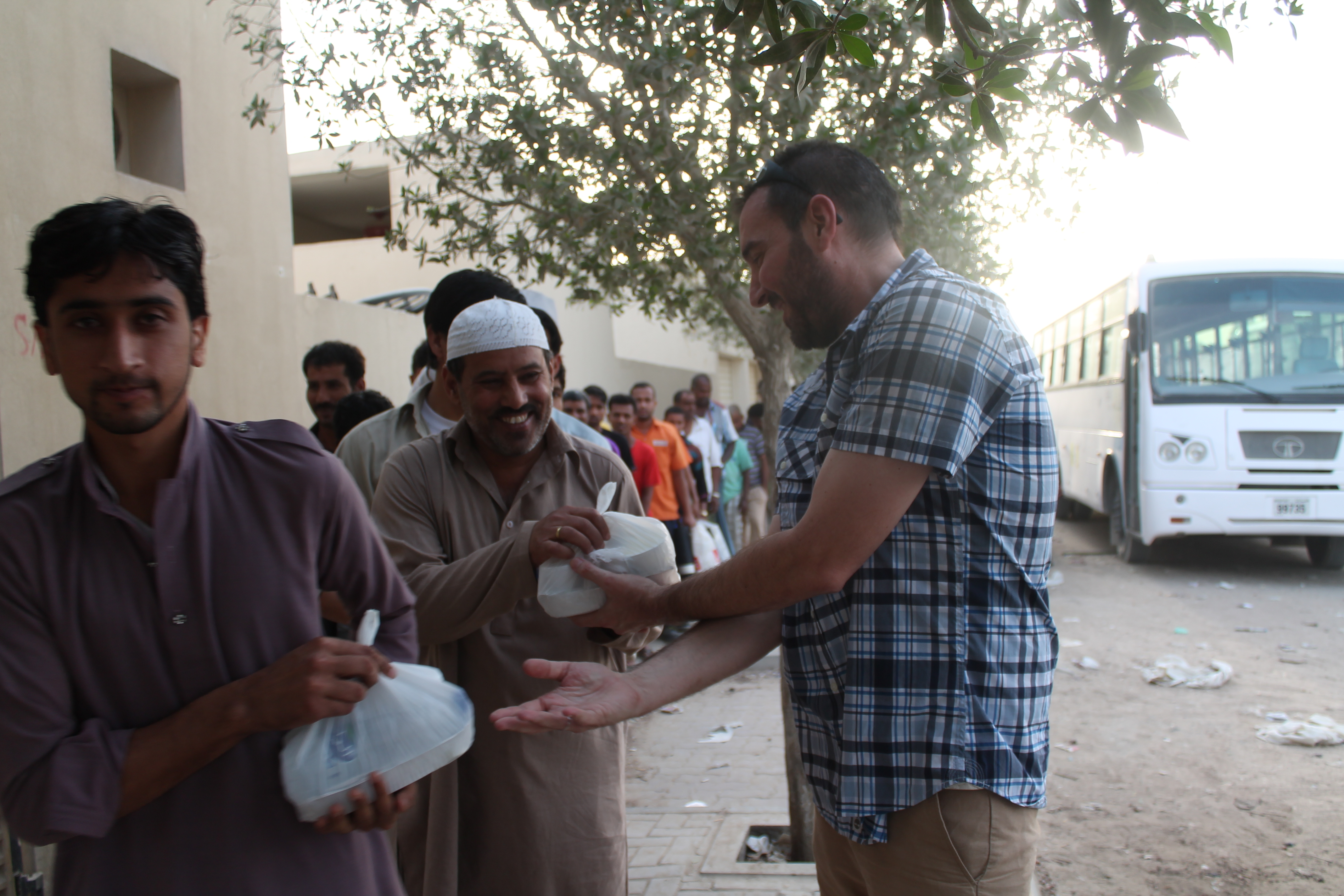 So, I had the choice of fretting over some random dick depriving me of my music for 24 hours, or I could get off my ass and organise an Iftar handout for a few men. I chose the latter. For the uninitiated, Iftar is the meal that breaks the daily Ramadan fast when the sun goes down. It’s a big deal in Dubai, with every restaurant in the city offering huge buffet feasts for the privileged amongst us. A recent article in a local newspaper highlighted the incalculable waste produced by these buffets. The amount of food that gets thrown away is simply mindboggling. Especially when you think about the masses of less fortunate, unseen people, hidden away in the industrial desert areas of the city. The men who work exhausting hours, struggling to scrape together the equivalent of AUD290 a month (working six days a week, fourteen hours a day), most of which they send back home to their families.